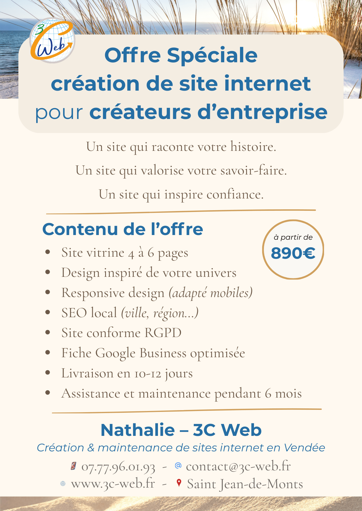Basée en Vendée, 3C Web intervient principalement sur les secteurs de Saint‑Jean‑de‑Monts, Saint‑Gilles‑Croix‑de‑Vie, Sallertaine, Soullans, Saint‑Hilaire‑de‑Riez, Commequiers, Notre‑Dame‑de‑Riez, Notre‑Dame‑de‑Monts, La Barre‑de‑Monts, Le Perrier, ainsi que Rocheservière et les communes alentours.3C Web vous accompagne pour la création ou la refonte de votre site internet selon vos besoins avec pour objectifs :